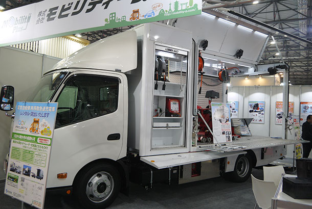 モビリティープラスは同社が取り組んでいるのが多目的で使用できる発電装置付サービスカーの普及。三輪社長は「BCP(事業継続計画)の要は電力。車載電源装置『True-Gハイブリッド』を進化させることで、緊急時にタイヤサービスカーから建物に給電し事業継続をサポートすることが可能となる」と話す。