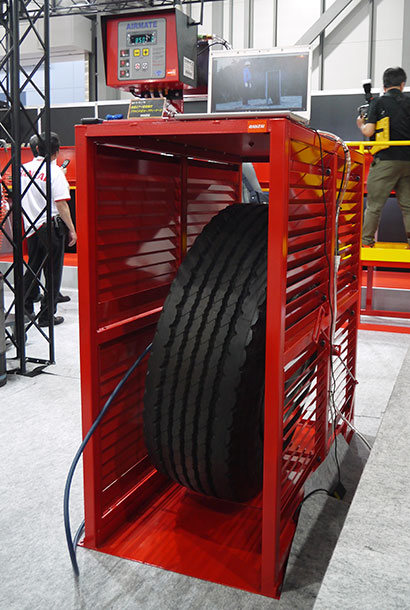 小野谷機工は「タイヤを組む」が展示テーマ。「たったひと押し、あなたもプロ気分」のサブタイトルが示すように、オートマチックタイプのタイヤ整備機器を参考出品し、省人化と作業の軽労化への対応施策を提案した。